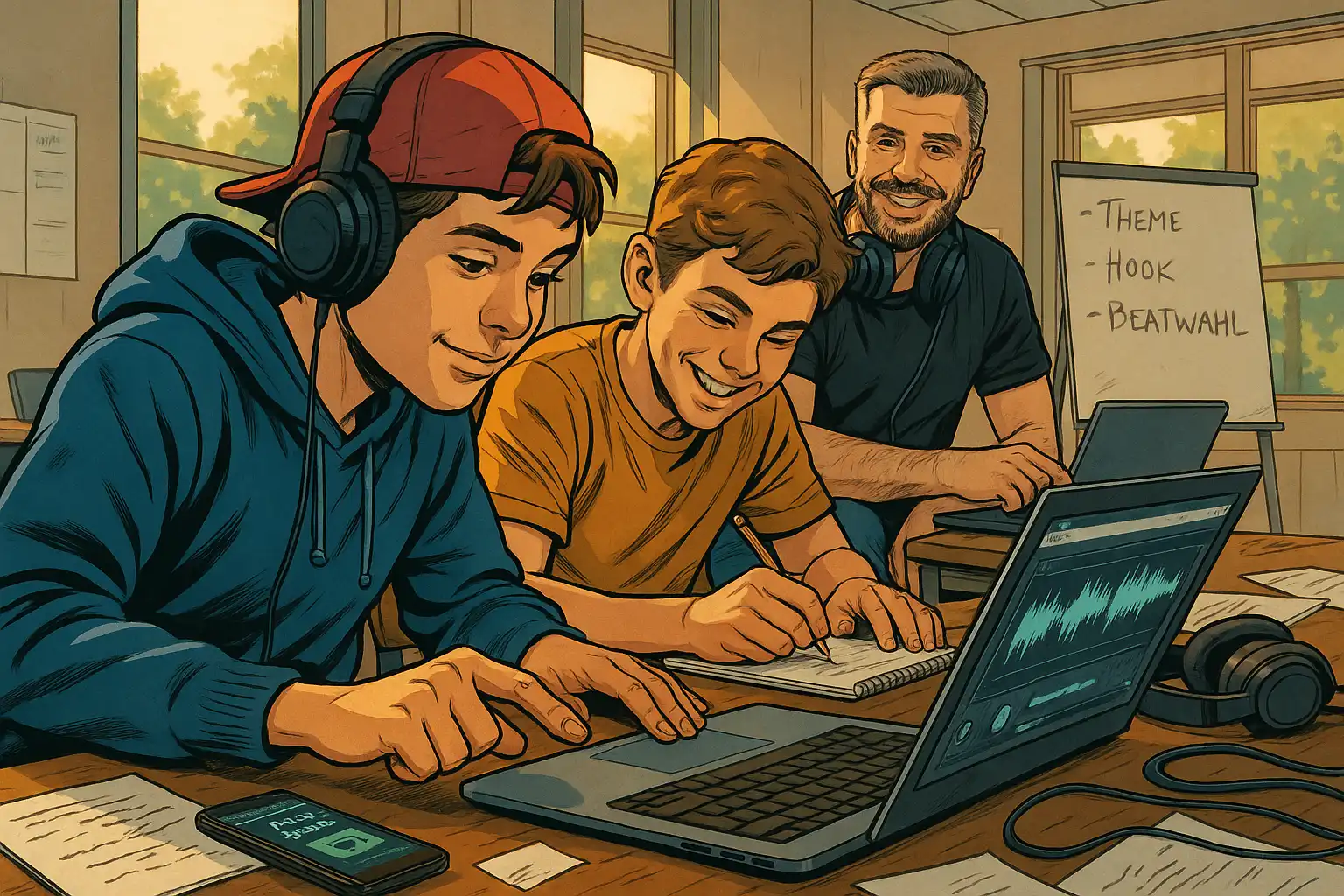 Die Inhalte sind flexibel, die Energie bleibt gleich: Beats hören, Texte schreiben, Flow entdecken, gemeinsam rappen. In kürzeren Formaten (ab ca. 2 Stunden) steht das Erlebnis im Vordergrund: erste Reime, Mikrofon ausprobieren, spielerisch mit Sprache arbeiten. Ab einem Ganztag entsteht oft ein kompletter Song – mit professioneller Aufnahme, echtem Studiogefühl und dem Stolz, Teil von etwas Echtem zu sein. Bei längeren Formaten kann zusätzlich ein Musikvideo gedreht werden oder ein Live-Auftritt entstehen – ganz nach Wunsch und Rahmen.